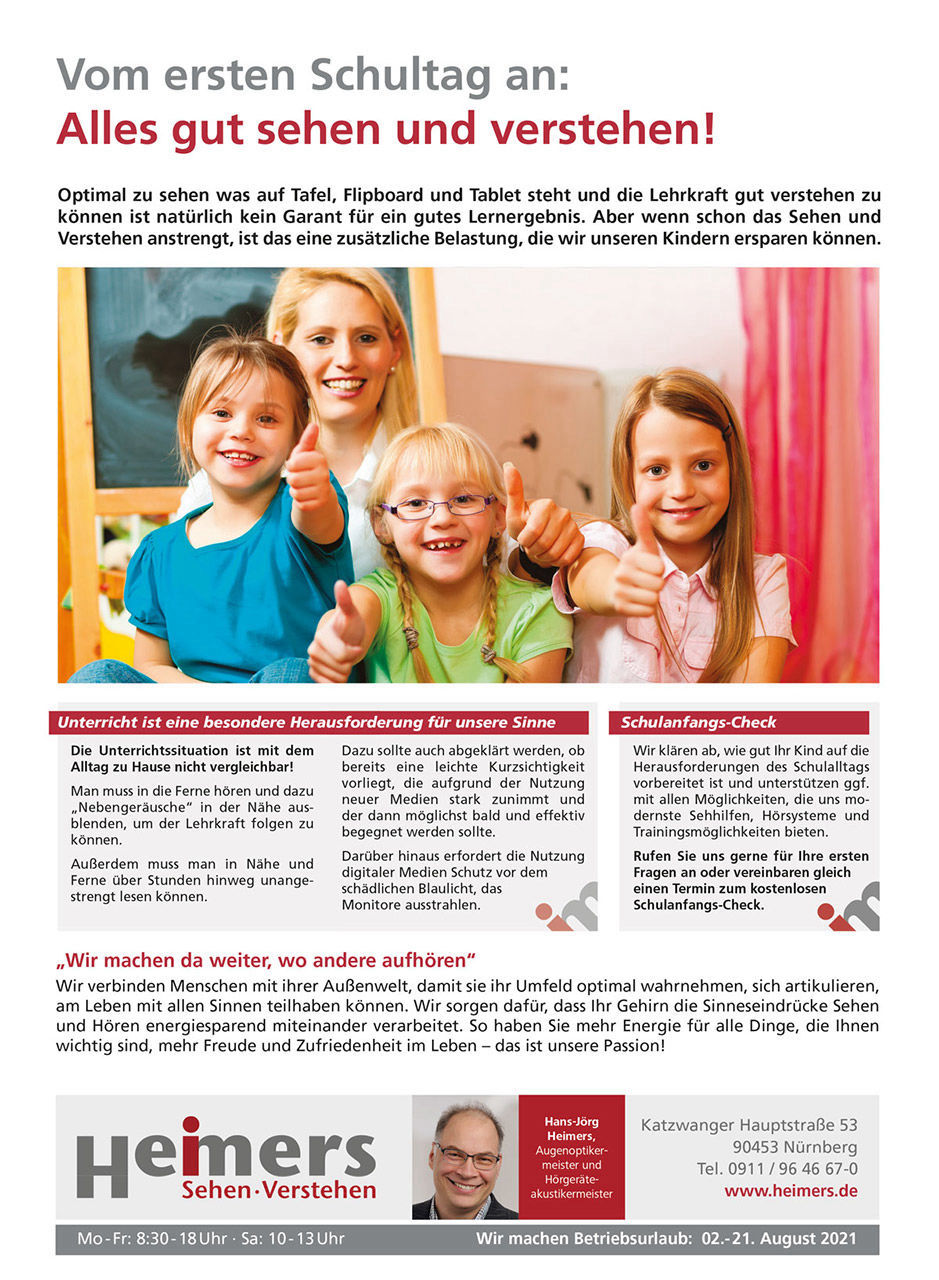 Ihr Augenoptiker und Hörgeräteakustiker Heimers in Nürnberg. Wir machen da weiter, wo andere längst aufhören und Sie werden erstaunt erkennen: Sehen ist nicht gleich Sehen und Hören ist nicht gleich Verstehen. Perfekt angepasste Brillen, Kontaktlinsen und Hörsysteme helfen dabei, die Leistungskraft Ihrer Sinne zu erhalten und sie gleichzeitig ohne Ermüdungserscheinungen zu fordern. Übrigens: Als von Zeiss zertifiziertes Relaxed Vision ® Center passen wir mithilfe neuester optometrischer Technologien die Brille individuell und optimal Ihren Augen an. Unsere Leistungen Fernbrille, Nahbrille, Gleitsichtbrille, Arbeitsplatzbrille, Raumbrille, Nachtbrille und DriveSafe-Gläser, Sonnenbrille, Gläser für die digitale Welt, ZEISS Brillengläser mit i.Scription® Technologie, Kontaktlinsen, Hörgerät, Hörsystem, Gehörschutz, Ohrhörer, PSA, In-Ear-Monitoring, Augenprüfung, Hörtraining, Höranalyse, Reparatur und Reinigung. Heimers, Ihr Augenoptiker und Hörgeräteakustiker, betreut Kunden aus Nürnberg, Katzwang, Reichelsdorf, Eibach und Schwabach.