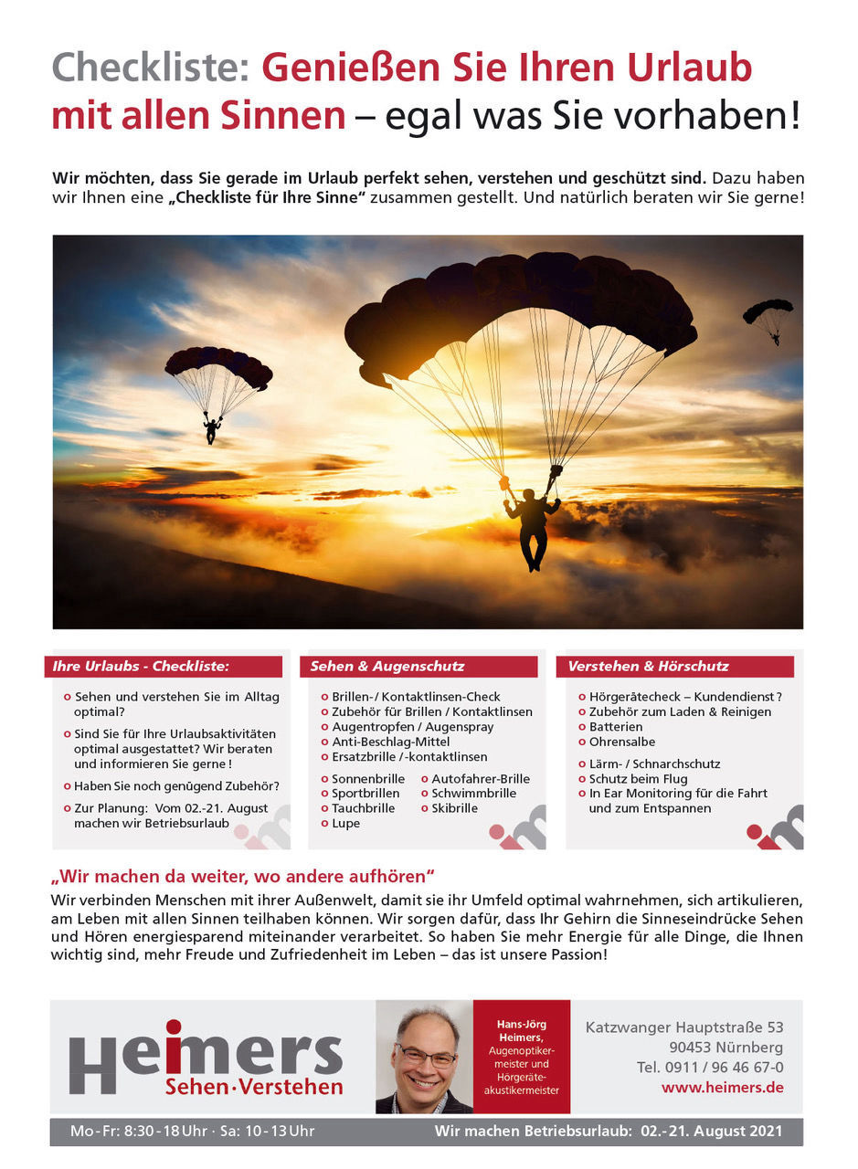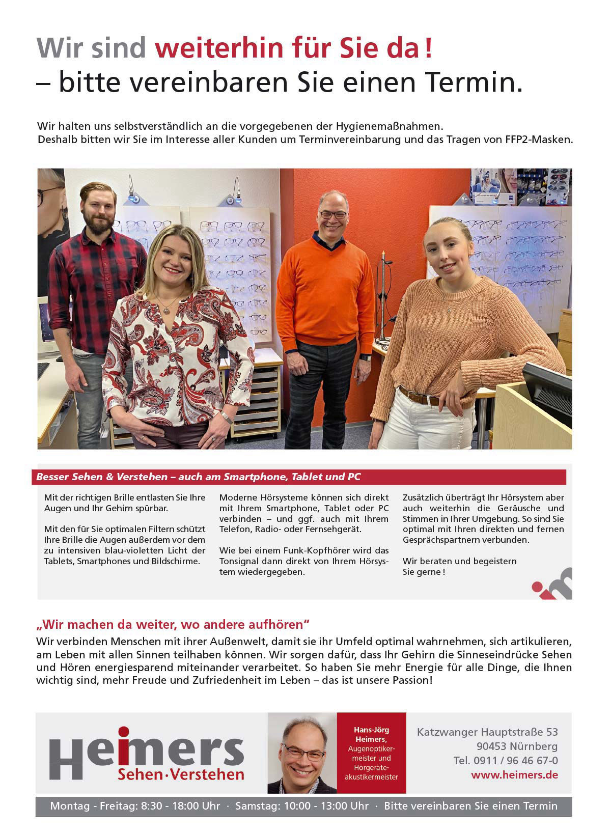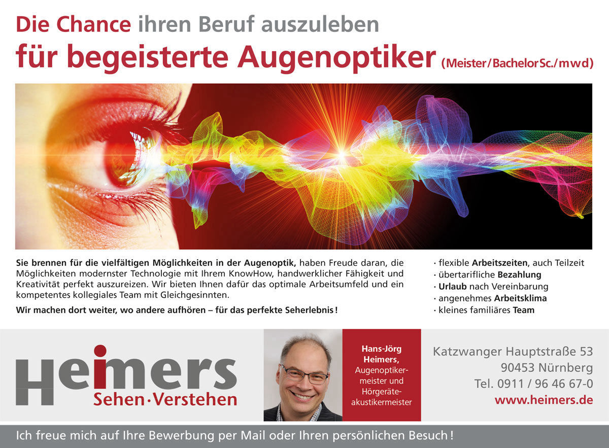 Ihr Augenoptiker und Hörgeräteakustiker Heimers in Nürnberg. Wir machen da weiter, wo andere längst aufhören und Sie werden erstaunt erkennen: Sehen ist nicht gleich Sehen und Hören ist nicht gleich Verstehen. Perfekt angepasste Brillen, Kontaktlinsen und Hörsysteme helfen dabei, die Leistungskraft Ihrer Sinne zu erhalten und sie gleichzeitig ohne Ermüdungserscheinungen zu fordern. Übrigens: Als von Zeiss zertifiziertes Relaxed Vision ® Center passen wir mithilfe neuester optometrischer Technologien die Brille individuell und optimal Ihren Augen an. Unsere Leistungen Fernbrille, Nahbrille, Gleitsichtbrille, Arbeitsplatzbrille, Raumbrille, Nachtbrille und DriveSafe-Gläser, Sonnenbrille, Gläser für die digitale Welt, ZEISS Brillengläser mit i.Scription® Technologie, Kontaktlinsen, Hörgerät, Hörsystem, Gehörschutz, Ohrhörer, PSA, In-Ear-Monitoring, Augenprüfung, Hörtraining, Höranalyse, Reparatur und Reinigung. Heimers, Ihr Augenoptiker und Hörgeräteakustiker, betreut Kunden aus Nürnberg, Katzwang, Reichelsdorf, Eibach und Schwabach.